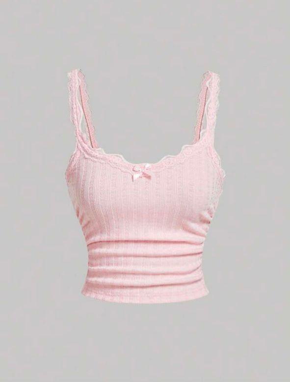Pink Tank Top With Pleated Lace Patchwork Bow